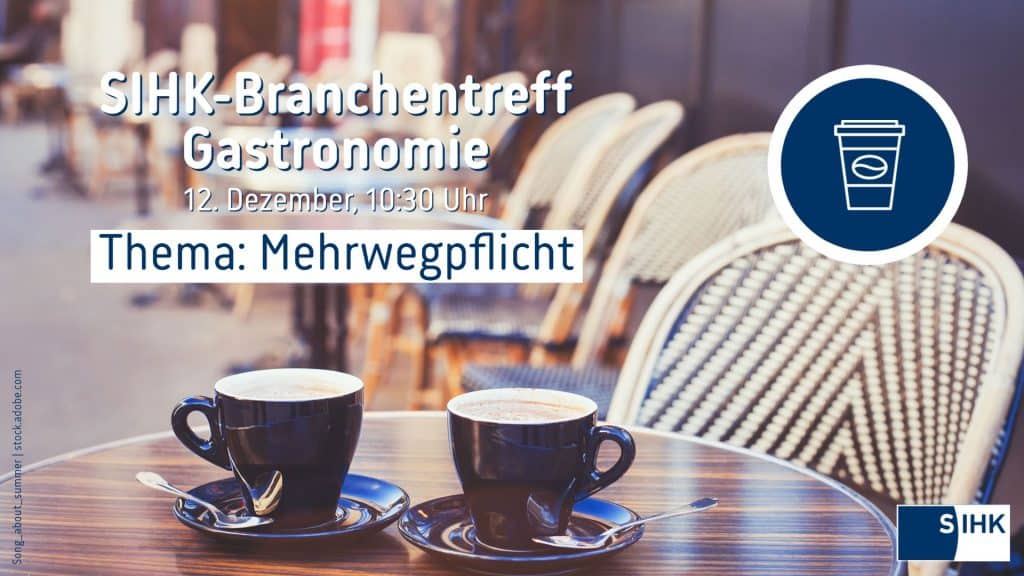 Das Jahresende naht und damit auch die „Mehrweg-Angebotspflicht“ für die Gastronomie. Gemeinsam mit der DEHOGA bietet die SIHK einen virtuellen Branchentreff Gastronomie zu diesem Thema an: am 12. Dezember 2022 um 10.30 Uhr.