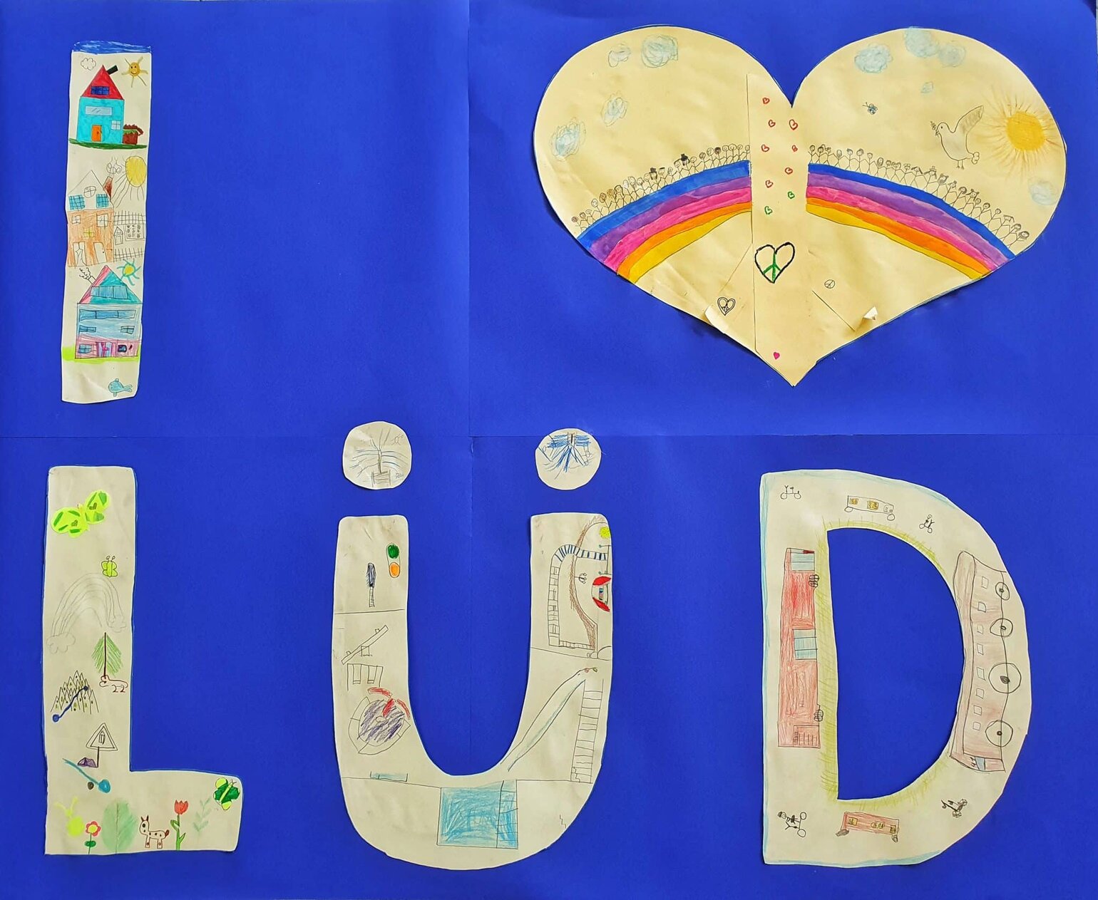 Die Kinder der Klasse 3b haben sich im Vorfeld des Projekts intensiv damit auseinandergesetzt, was sie sich für ihre Stadt in Zukunft wünschen würden. Diese Ideen sind dann in den gemeinsame Schriftzug “I ♡ LÜD” eingeflossen.