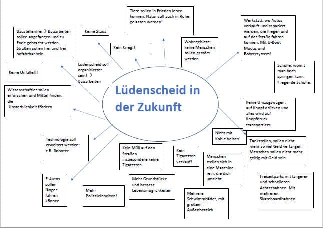 Als Einstieg in das Projekt haben alle Kinder in den verschiedenen Klassen Bilder aus dem heutigen Lüdenscheid angesehen. Im Brainstorming konnten sie sich dann frei zu den Fragen der Zukunft äußern.